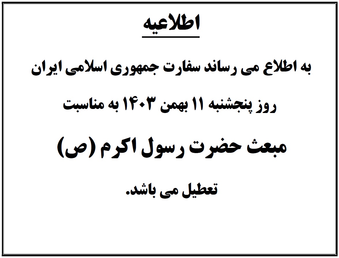 تعطیلی سفارت جمهوری اسلامی ایران در تاریخ پنجشنبه 11 بهمن ماه 1403 به مناسبت مبعث حضرت رسول اکرم (ص)