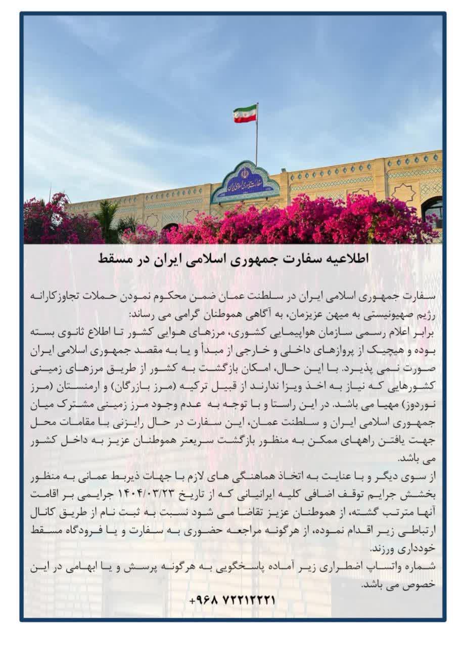 سفارت جمهوری اسلامی ایران در عمان ضمن محکوم نمودن حملات تجاوزکارانه و نامشروع رژیم صهیونیستی به میهن عزیزمان، به اطلاع هموطنان گرامی میرساند:
